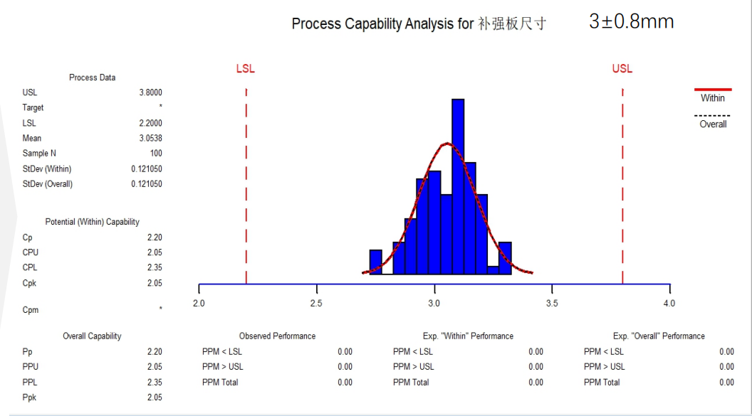 潛在的(內部)能力:Cp 2.2,CPU 2.35,CPL 2.35 Cpk 2.05。